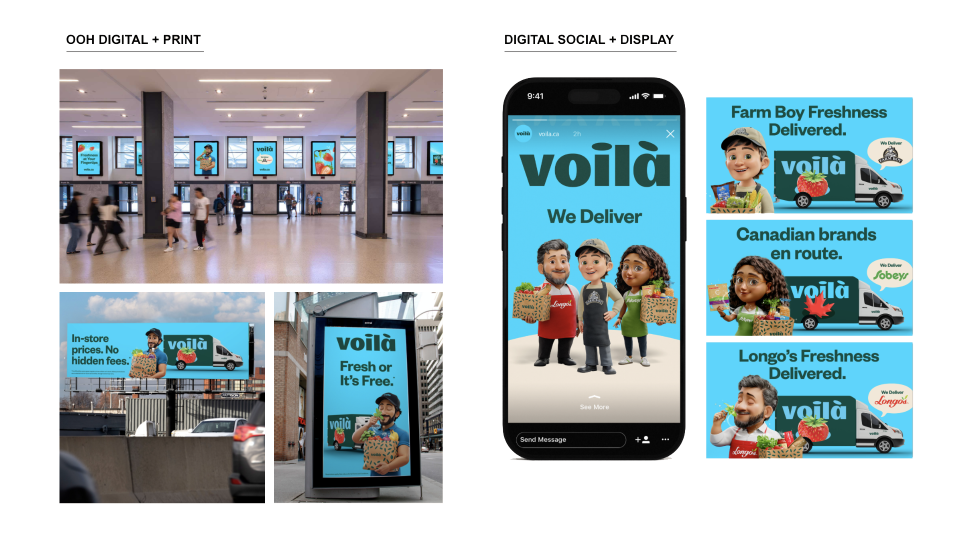 The grocery delivery space has become cluttered with competitors. Despite strong awareness, people were still asking “What’s a Voilà?” We wanted to anchor our story in trust and value by bringing Sobeys, Farm Boy, and Longo’s together in one world. Additionally, we leaned on DIG insights: freshness, value, and proudly Canadian—crafted into a single, cohesive brand story, all grounded in the recent Sklar Wilton research where Voilà was Rated Best in Overall Value.